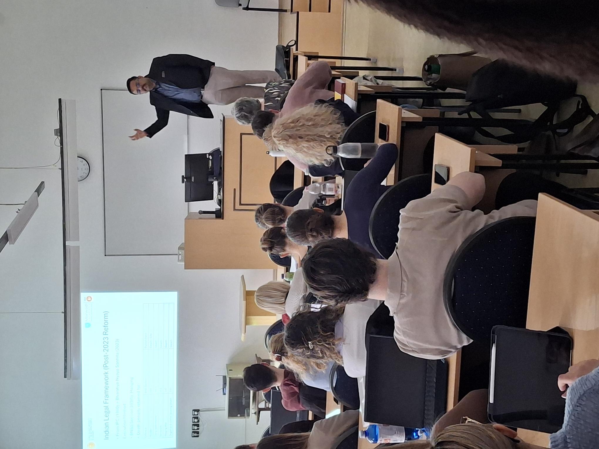 Az előadó a Bűnügyi Tudományok Intézetében összesen három előadást tartott. Február 18-án Prof. Dr. Czine Ágnes büntetőeljárásjogi szemináriumának keretében 90 perces, angol nyelvű prezentációt tartott „Az indiai és a magyar büntetőeljárás összehasonlítása” címmel. Előadásában átfogó képet adott az indiai büntető igazságszolgáltatási rendszer felépítéséről, kitérve az eljárás alapelveire, a bizonyítás sajátosságaira, valamint a terhelti jogok érvényesülésére. A magyar szabályozással való összevetés rávilágított a két jogrendszer közötti strukturális és dogmatikai különbségekre, ugyanakkor a hasonló garanciális megoldásokra is.