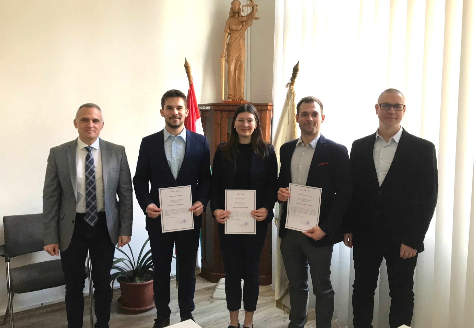Prof. Dr. Tóth J. Zoltán Dékán Úr dékáni dicséretben részesítette dr. Székely Botond PhD-hallgatót, Kovács Lili Petra és Gruber András II. éves joghallgatókat a KRE ÁJK nemzetközi jóhírnevének öregbítéséért. A három hallgató egyszerre két idegen nyelven, németül és angolul állt helyt a dr. habil. Arató Balázs szervezésében a grazi Johannes Kepler Egyetemmel közösen 2023 decemberében megrendezett többnapos kihelyezett szemináriumon és nemzetközi konferencián.
